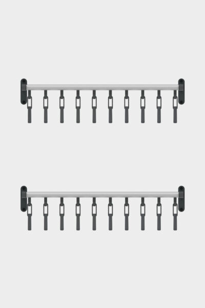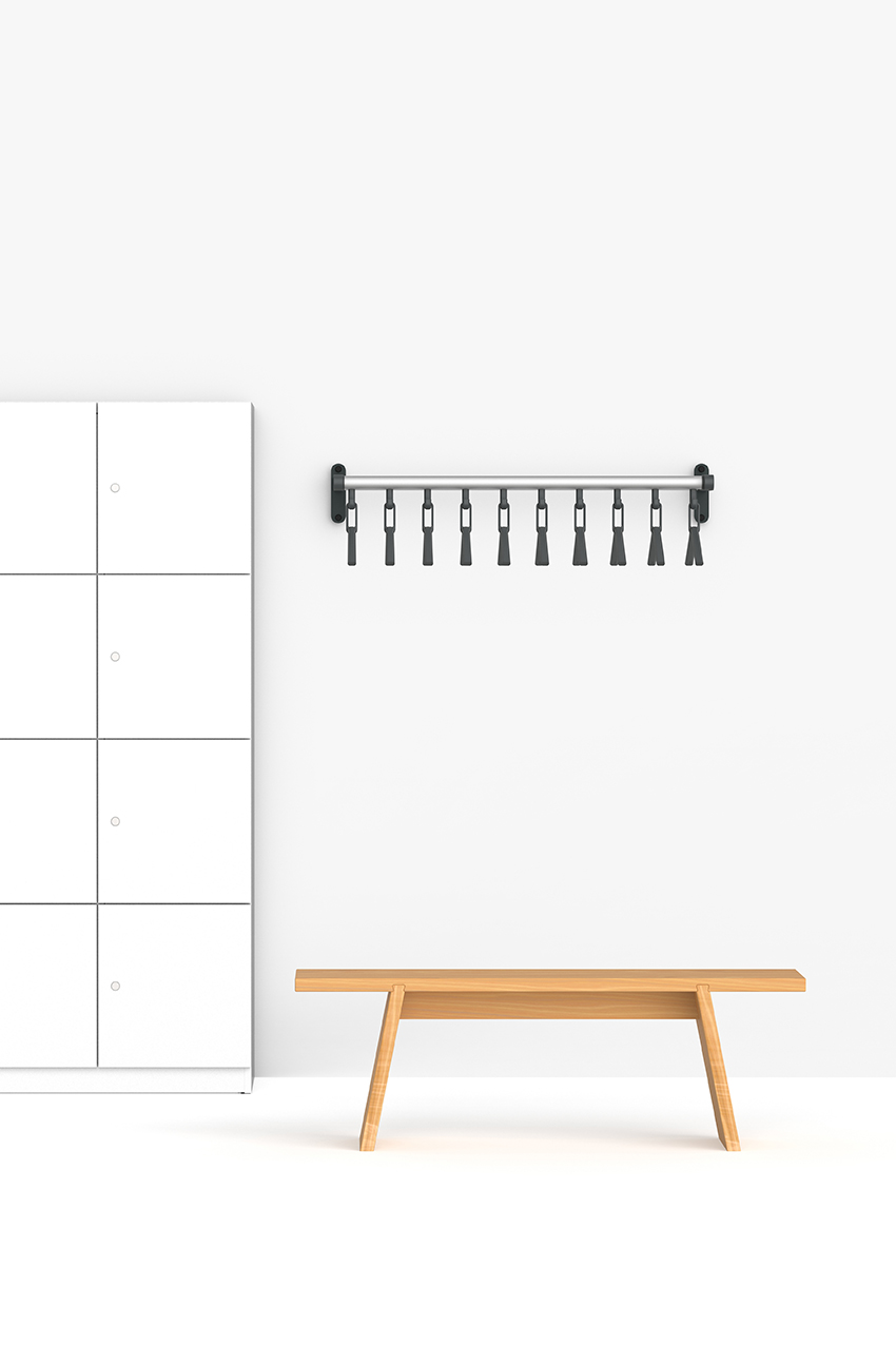 The cloakroom rack is supplied as standard with matching Tertio coat hangers. The coat hangers are self-aligning, so they always hang nice and straight.