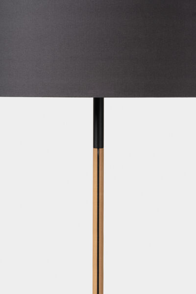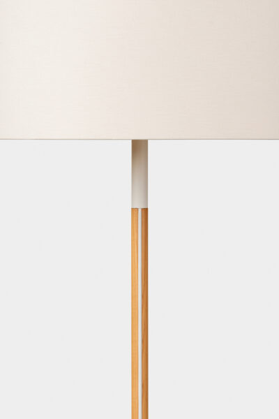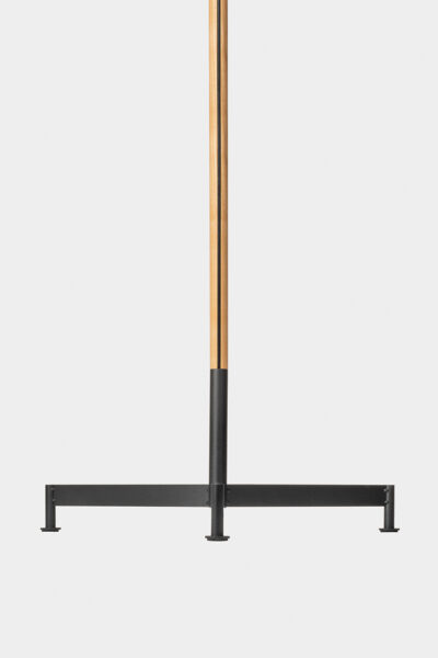De Stoklamp van Floris Hovers is een harmonieuze combinatie van drie verschillende onderdelen: een stalen voet, een houten staander en een stoffen kap. In tegenstelling tot veel andere staande lampen verbergt de Stoklamp het elektriciteitssnoer niet. Het snoer is juist volledig zichtbaar en vormt een lijn die kap, staander en voet met elkaar verbindt – een lijn die het kenmerkende element van de lamp is.