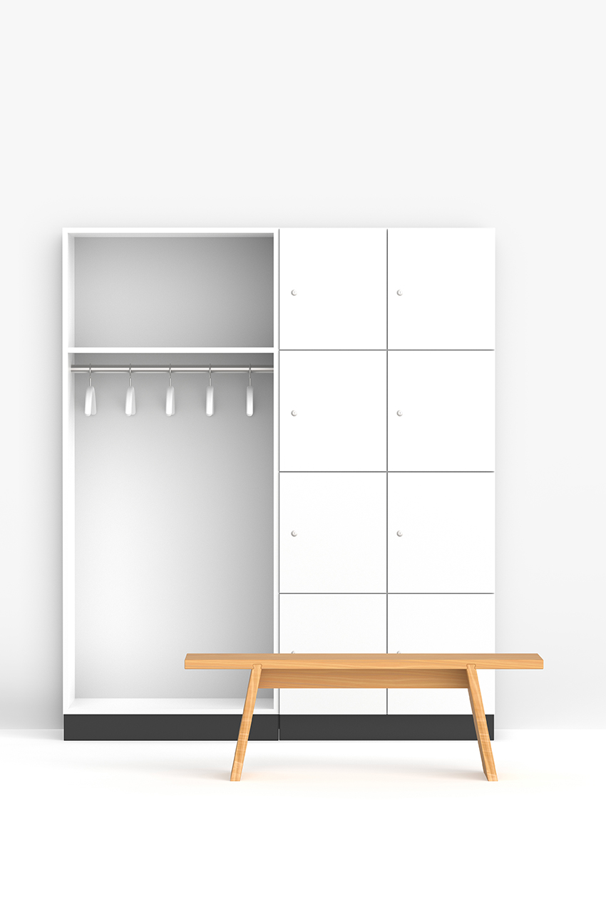 Maak kennis met de Aquarius houten garderobe. Deze open garderobe sluit naadloos aan op elke opstelling met houten lockers uit de Aquarius-serie. Het resultaat is een stijlvolle 2-in-1-oplossing: lockers voor je medewerkers of vaste bezoekers en een kapstok voor gasten die hun jas willen ophangen.